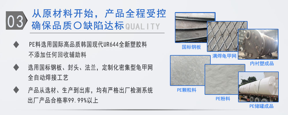 公司有鋼襯塑PE/PO、PE全塑、碳鋼、不銹鋼四大系列100多個品種,專注于常壓儲存容器生產,其產品包括鋼襯塑儲罐、管口一體成型PE儲罐、碳鋼儲罐、不銹鋼儲罐、反應釜、攪拌罐、離子交換柱、鋼襯PE/PO儲罐塑料儲罐、鹽酸儲罐、硫酸儲罐等等。更大限度滿足廣大客戶的各種需求,同時可以根據客戶的需要加工定制各種防腐設備。